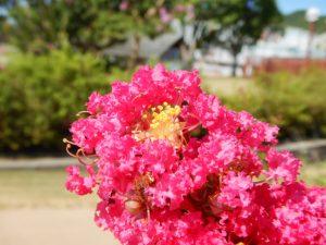 サルスベリはフリフリした6枚の花びらの付き方がユニーク。まとまって咲いている様子もいいですが、単品の花がかわいいので、是非近くに寄って見てみてください。
