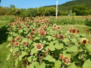 ポプラの丘のヒマワリは、品種によってはまだ見ごろのものもありますが、全体的には終盤に近づいてまいりました。赤色がかったヒマワリは、普通に咲いていても枯れているように見えてちょっと残念。
