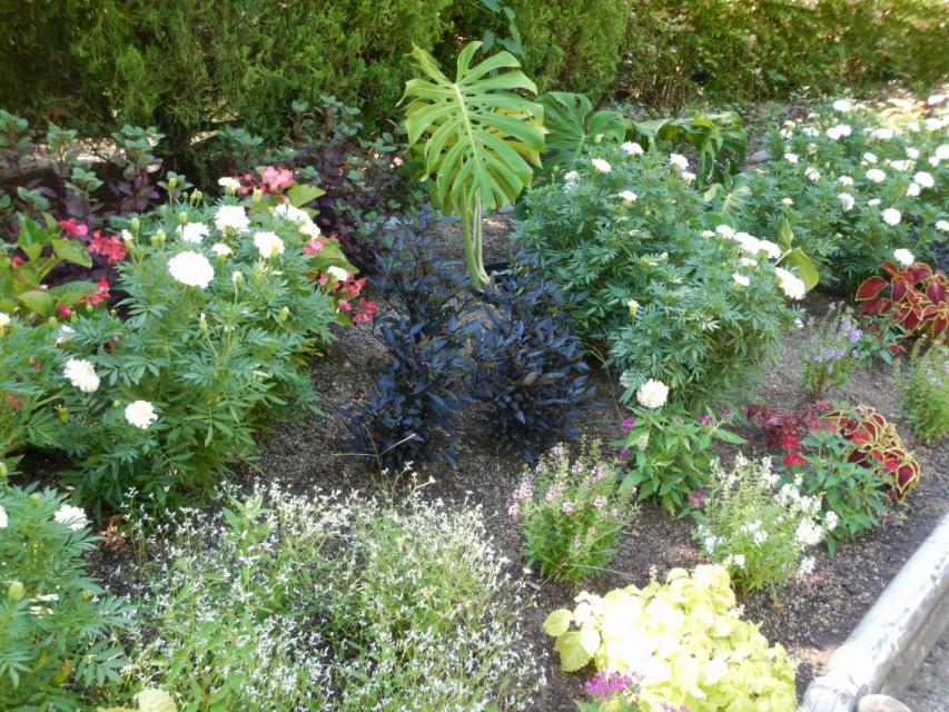 連絡口ゲートから入った時に突き当りに見えてくる花壇が半円形花壇です。今年もここに派手な葉っぱを主として植えています。
