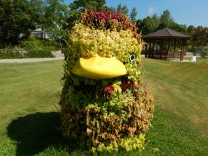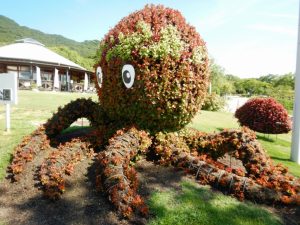立体花壇「アヒル」のコリウス(場所:大地の虹北花壇)と「タコトピアリー」のベゴニア(場所:東浦口ゲート前)