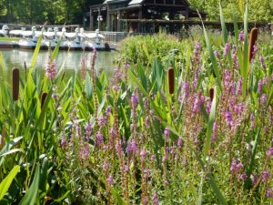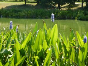 ピンク色のミソハギ、ホットドッグのようなガマ、水色のポンテデリアが水辺に涼しげに咲いています。