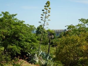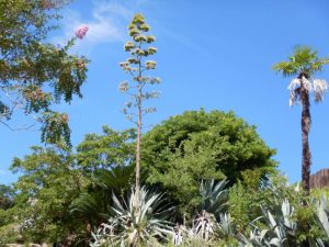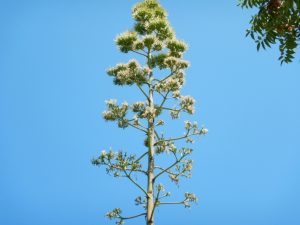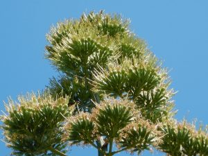 数十年に一度開花する珍しい花と言われているアオノリュウゼツラン。今年は1株ニョキニョキ育ちました。下半分の開花は終わり、ソボソボッとなっています。