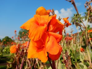 青空に映えるオレンジ色。‘The 夏!’といった感じなのに、秋の終わりまで咲き続けるんですよ。
