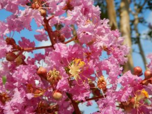 サルスベリはフリフリした6枚の花びらの付き方がユニーク。まとまって咲いている様子もいいですが、単品の花がかわいいので、是非近くに寄って見てみてください。
