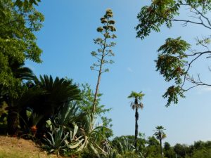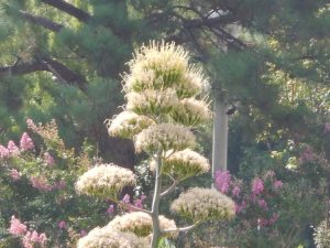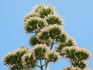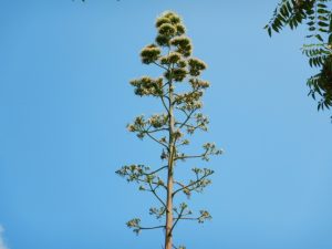 数十年に一度開花する珍しい花と言われているアオノリュウゼツラン。今年は1株ニョキニョキ育ちました。今日現在、てっぺんまでモサモサに見えますので、多分咲き切りました(写真4枚目は空のテラスから望遠で撮影)。あとは徐々に散っていきます。