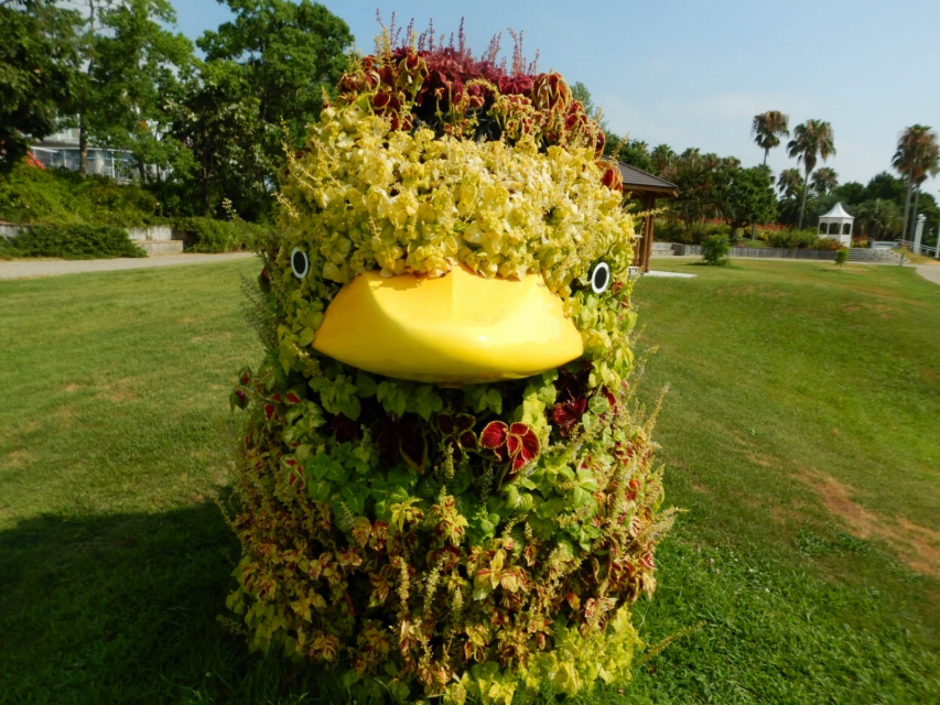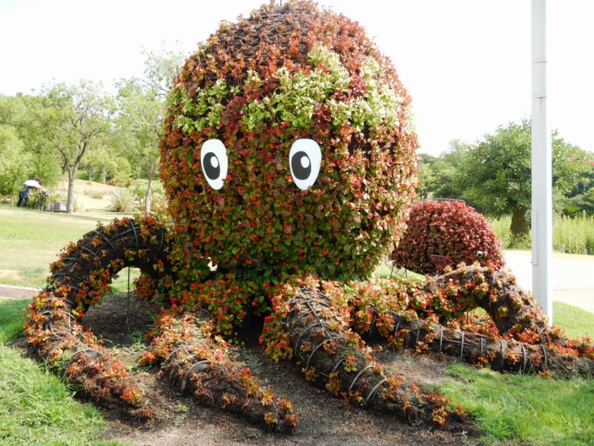 立体花壇「アヒル」のコリウス(場所:大地の虹北花壇)と「タコトピアリー」のベゴニア(場所:東浦口ゲート前