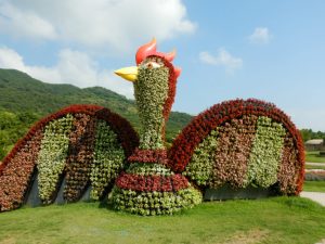 デンとそびえ立つ花火鳥。4メートルもの高さで、鳥本体から尾羽の先までは30メートルもあるんですよ。日陰もなく暑い場所ではありますが、来園されたら是非一緒に記念写真をどうぞ!