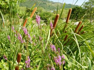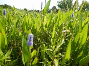 ピンク色のミソハギ、ホットドッグのようなガマ、水色のポンテデリアが水辺に涼しげに咲いています。
