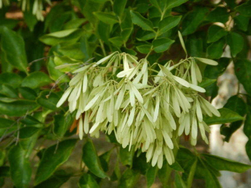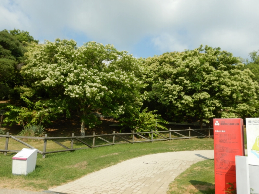 7月上旬は白い花がいっぱい咲き、大きな木全体がホワッと白っぽく見えます。今はその花が白いヒラヒラ付きの実に変わり、木が白く見えています。