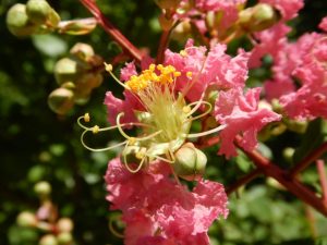 サルスベリはフリフリした6枚の花びらの付き方がユニーク。まとまって咲いている様子もいいですが、単品の花がかわいいので、是非近くに寄って見てみてください。
