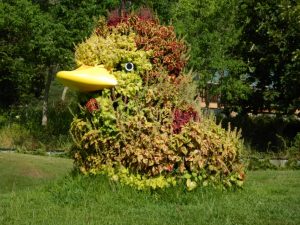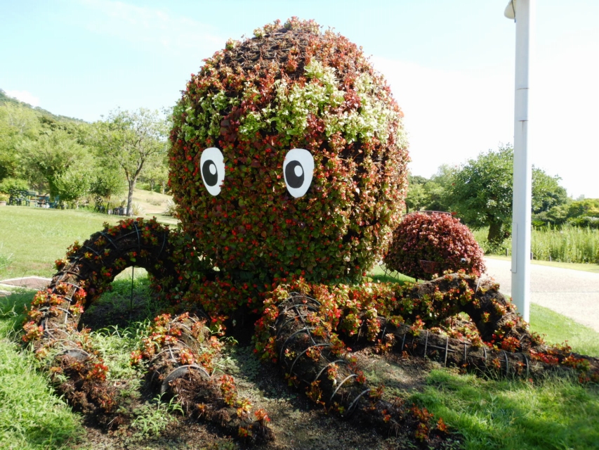 立体花壇「アヒル」のコリウス(場所:大地の虹北花壇)と「タコトピアリー」のベゴニア(場所:東浦口ゲート前