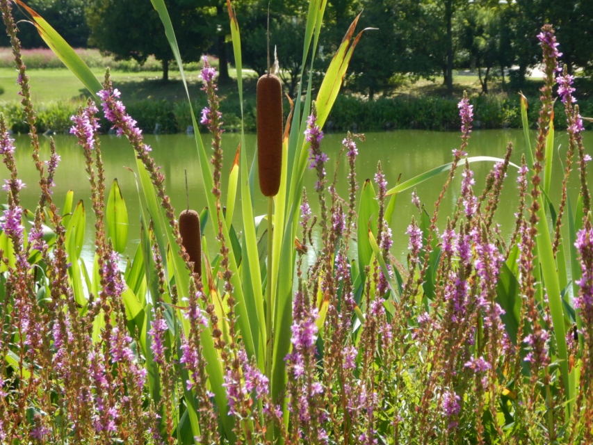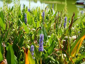 ピンク色のミソハギ、ホットドッグのようなガマ、水色のポンテデリアが水辺に涼しげに咲いています。
