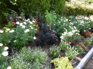 連絡口ゲートから入った時に突き当りに見えてくる花壇が半円形花壇です。今年もここに派手な葉っぱを主として植えています。