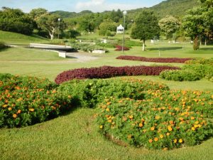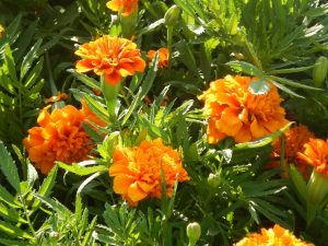 お花の形の花壇を埋めるマリーゴールド。暑さのせいか、開花が遅い!つぼみはいっぱい見えているのに開かないというもどかしい状況です。