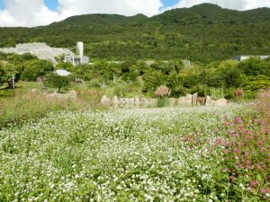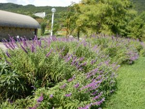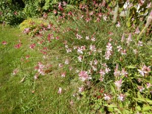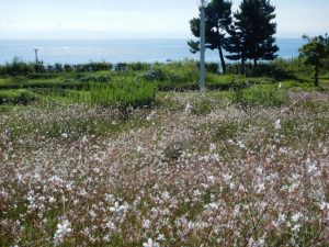 風にユラユラ白い蝶が飛んでいるような花、ガウラ。秋まで咲き続けます。海も一緒にきれいに見えるので、海岸口ゲートそばがおススメです(写真一・二枚目)。ちょっと見るだけでよければ移ろいの庭階段花壇の横に咲いていますよ。花の丘道には白以外にも濃いピンクの花もあります(写真三・四枚目)。