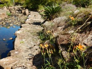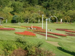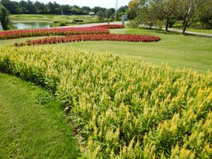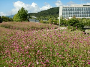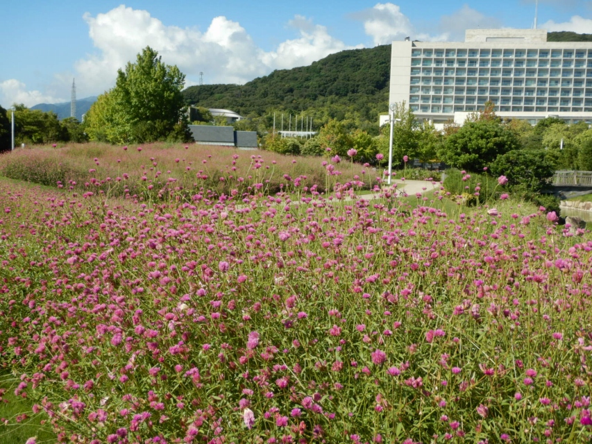 写真一枚目:花の中海周辺(大地の虹南花壇そば)、二枚目:移ろいの庭