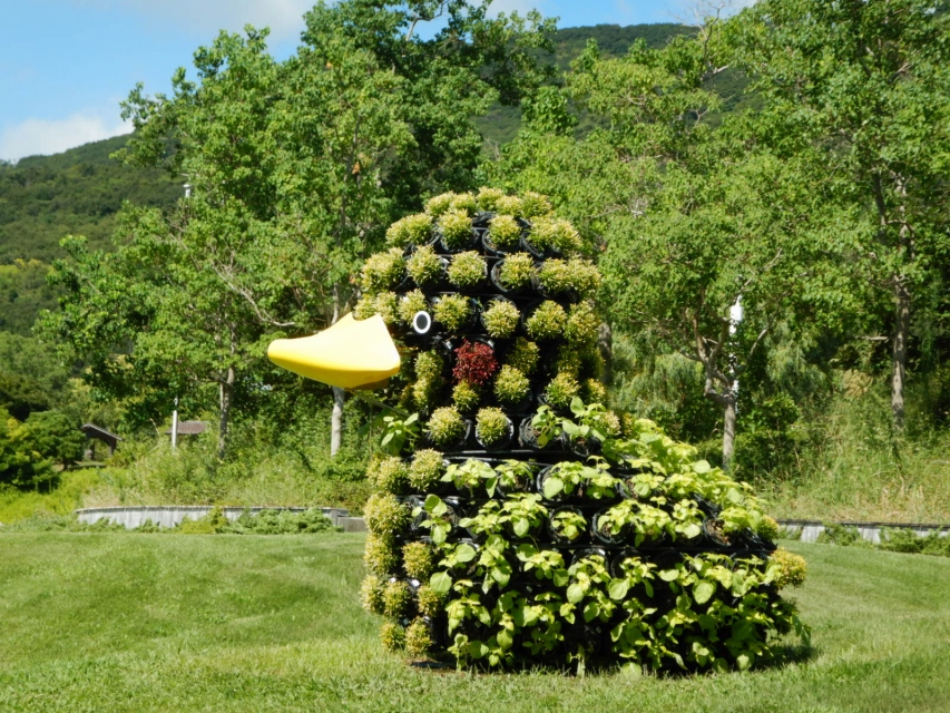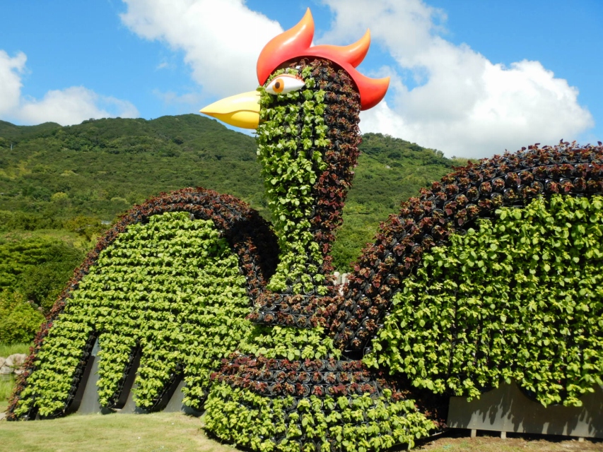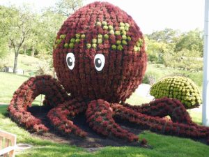 立体花壇「花火鳥」と「アヒル」(場所:大地の虹)、「タコトピアリー」(場所:東浦口ゲートそば)