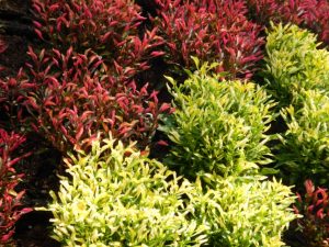 連絡口ゲートから入った時に突き当りに見えてくる花壇が半円形花壇です。今年もここに派手な葉っぱを主として植えています。