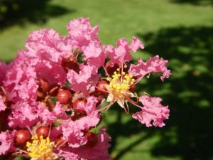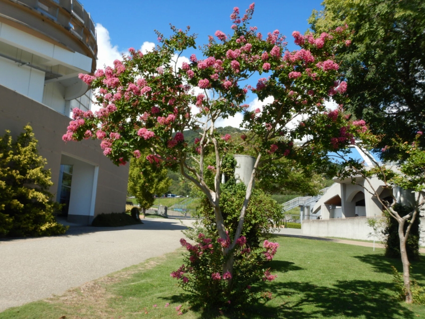 今年は全体的に花々が夏の暑さにやられていますが、サルスベリはがんばっています。近づいて見たことがない方は是非見てみてください。フリフリした6枚の花びらの付き方がユニークですよ。(写真:芝生広場(ビジター棟横))