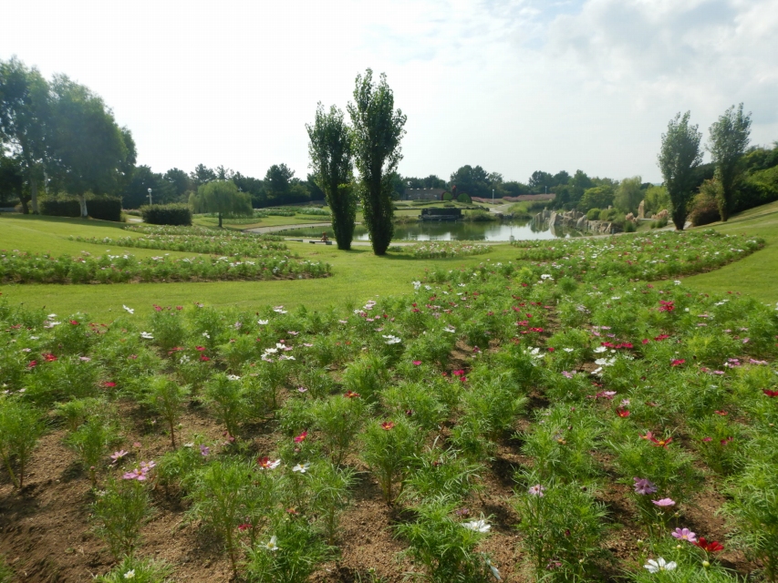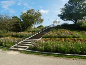 写真一・二枚目:大地の虹北花壇、三・四枚目:ポプラの丘(上段・キバナコスモス)、五枚目:ポプラの丘(下段)、六枚目:移ろいの庭階段花壇、