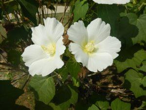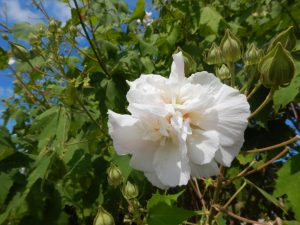 手のひらほどの大きなハイビスカスに似たお花で、ピンクと白の2色の木があります。八重咲きで酔ったように白→ピンクに色変わりするスイフヨウも1本あります。(写真一・二枚目:フヨウ、三・四枚目:スイフヨウ)