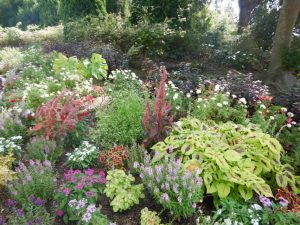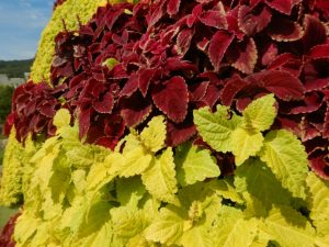 連絡口ゲートから入った時に突き当りに見えてくる花壇が半円形花壇です。派手な葉っぱを主として植えています。