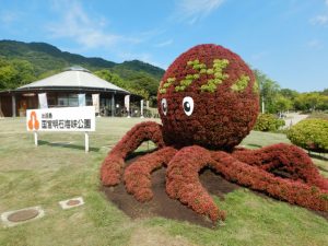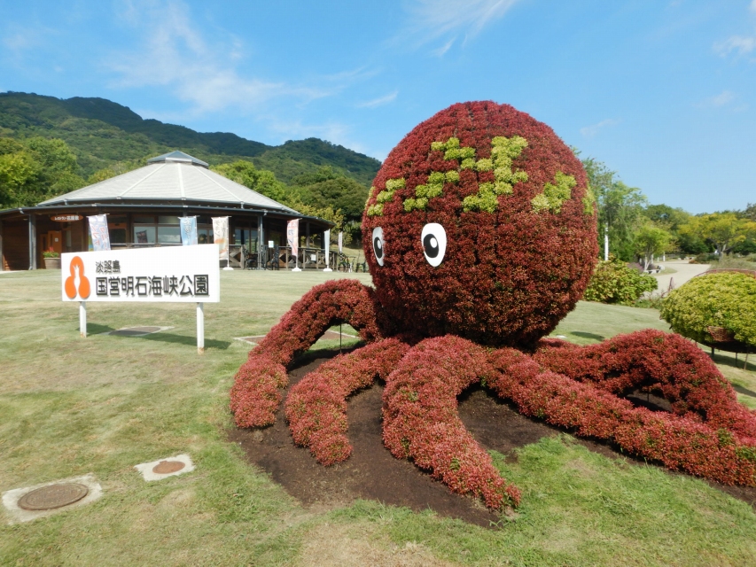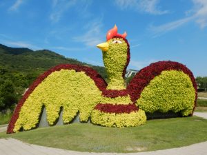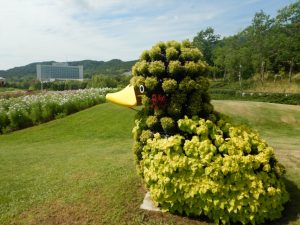 立体花壇「花火鳥」と「アヒル」(場所:大地の虹)、「タコトピアリー」(場所:東浦口ゲートそば)