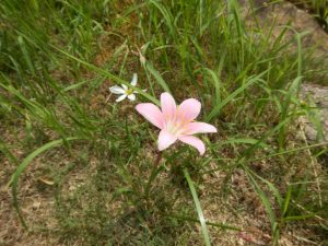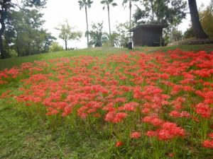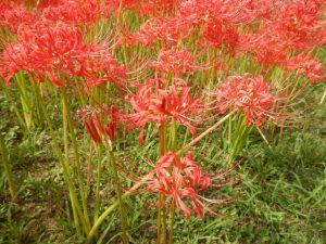 ヒガンバナのそばで、同じヒガンバナ科のゼフィランサス(タマスダレ)がチョコッとかわいく咲いています(写真四枚目)ので、ついでにそちらもご覧ください。
