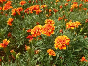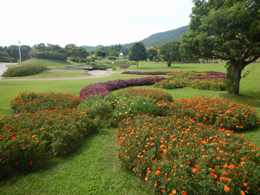 お花の形の花壇を埋めるマリーゴールド。今年は開花の進みが遅い!ようやく花数が多めになってきました。