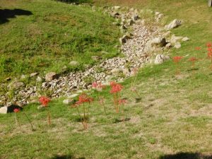 例年だとお彼岸の時期(9月後半)に咲くヒガンバナが、今年はなんとこんな時期まで。もちろん一斉大量開花は、松の谷も移ろいの庭も終わりました。しかしチョボチョボ残って咲いています。