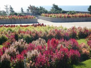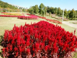 海のテラス周辺のケイトウは、見ごろ真っ盛りです。ポプラの丘と違う品種も植えてあり、華やかさとシックさを兼ね備えています。