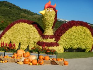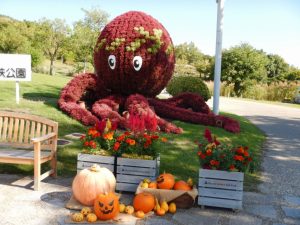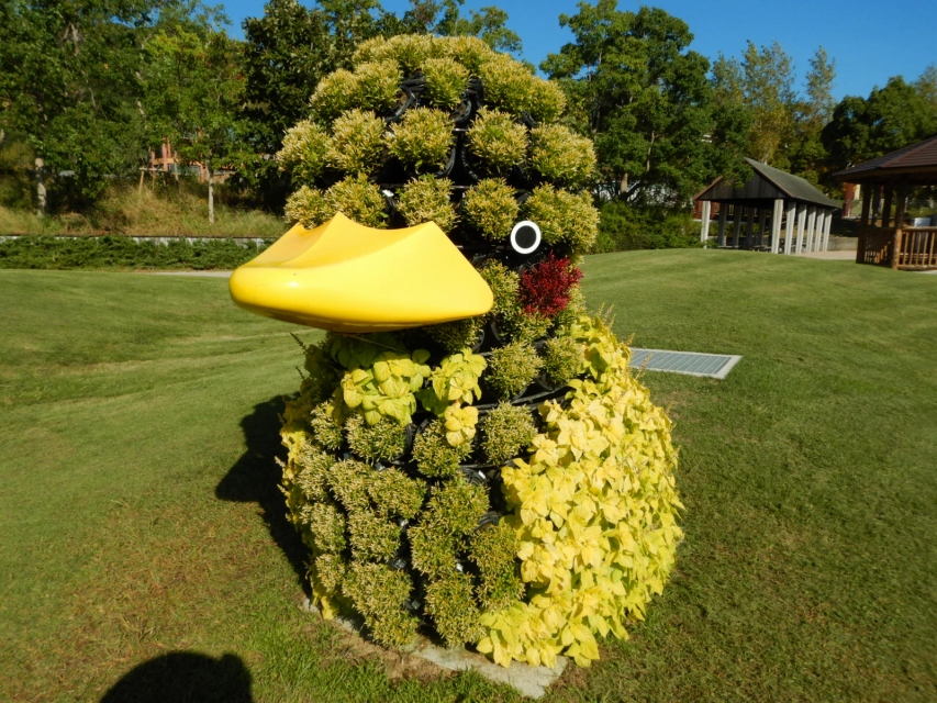 立体花壇「花火鳥」と「アヒル」(場所:大地の虹)、「タコトピアリー(蛸&鯛)」(場所:東浦口ゲートそば)