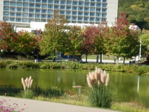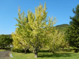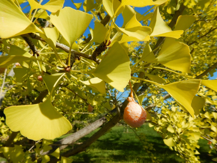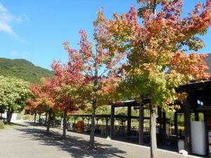ボート乗り場周辺ではモミジバフウがほんのり赤く、春一番の丘ではイチョウが緑から黄色へ移り変わり中。
