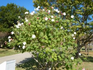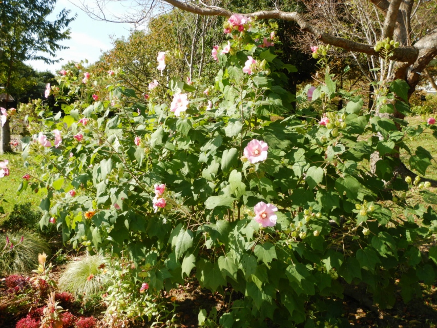 園内のフヨウは老朽などでめっきり減り、今は花の丘道とポプラの丘の接点あたりで数本見られる程度です。新たな植樹の準備をしているので、来年をお楽しみに。