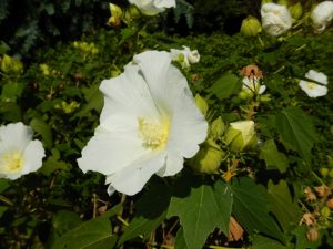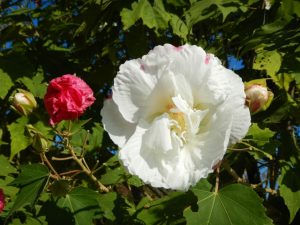 写真一枚目はピンクの一重、二枚目は白の一重のフヨウです。三・四枚目はスイフヨウ。スイフヨウは「酔芙蓉」という名の通り、午前中から午後にかけ、白い色から酔っぱらったようにピンクに変化します。この写真は午前中に撮影したため、酔っ払い前です。