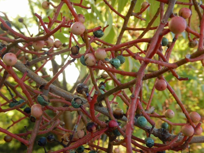 写真一枚目はカイノキ。最初は青っぽい色の実がだんだん赤くなり、最後は黒くなりますが、そろそろ青色は無くなってきました。芝生広場のトイレ両脇にある大きな木です。