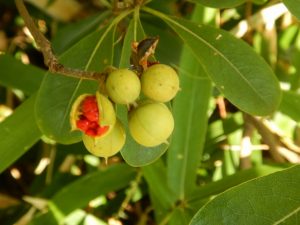 六枚目はトベラ。車輪のように集合したスプーン状の葉っぱの真ん中に、コロコロの実が集合。パカッと割れるとネトネトしたオレンジ色の果実が出てきます。海に近い園路沿いで見られます。