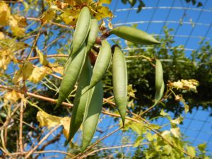 二枚目はノウゼンカズラ。10㎝くらいのバナナみたいなスナップエンドウみたいな実がぶら下がっています。海のテラスそばのアーチに絡まっています。