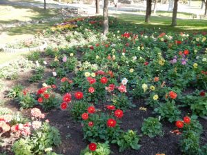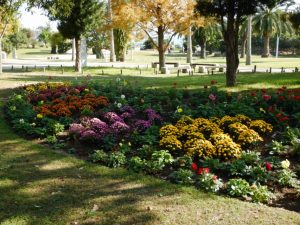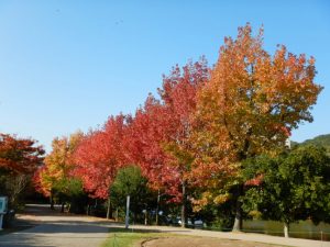 園内で美しく紅葉する樹木No.1はモミジバフウだと思います。今とってもきれいですよ。立体花壇「花火鳥」から東浦口ゲートの方を眺める構図が一番きれいかなぁ。例年はいまいちパッとしないポプラの丘の上段部あたりも、今年はきれいです。