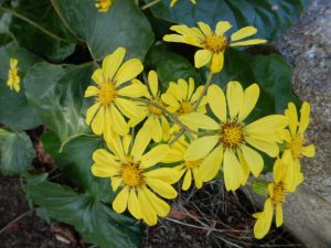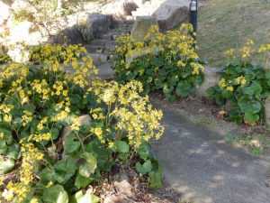 この花が咲くと、もうすぐ冬なんだなぁと思わせるツワブキ。園内では空のテラス周辺に多く咲いています。明らかに毎年着々と増殖していて、他の植物を凌駕しそうで恐怖恐怖…。