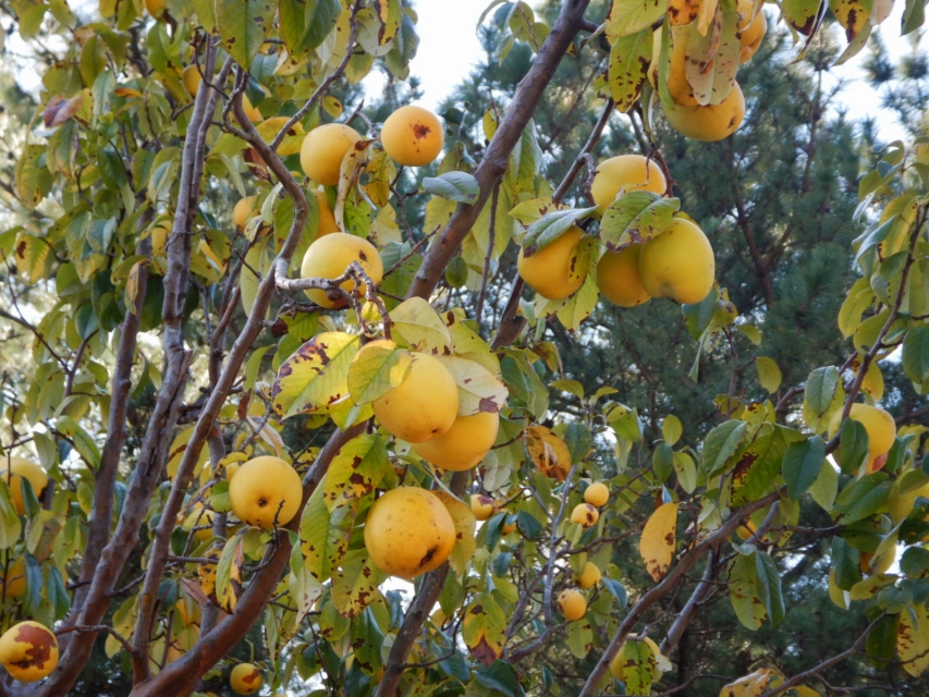 八枚目はカリン。リンゴくらいの大きさの実は非常に硬く、頭に当たると多分タンコブができるでしょう。松の谷と花の谷の間の園路沿いで見られます。
