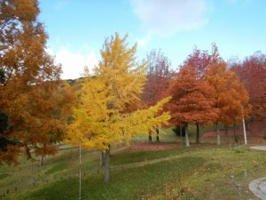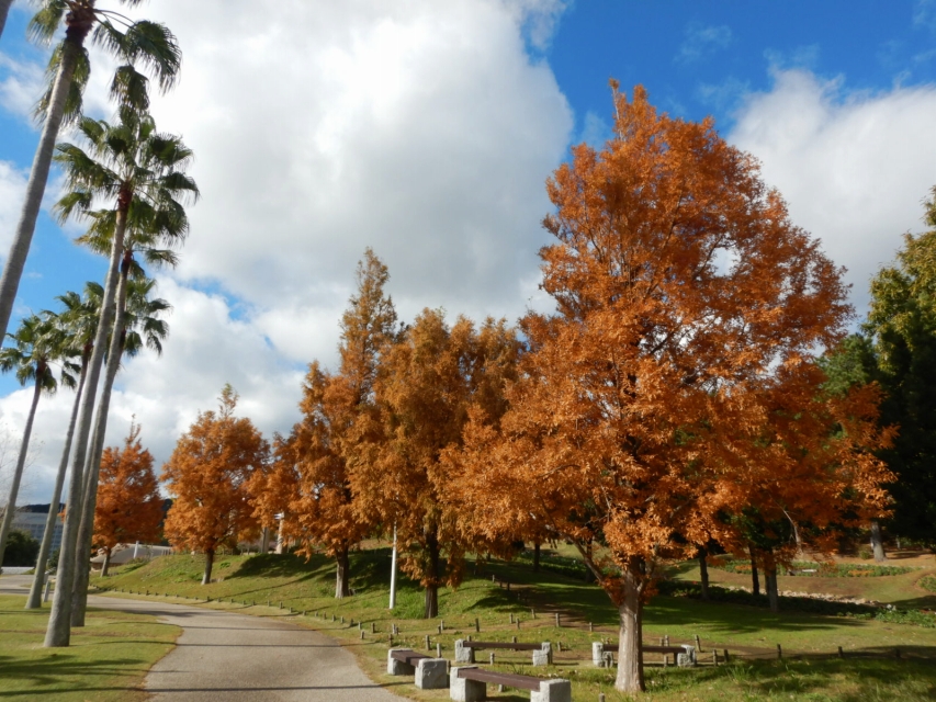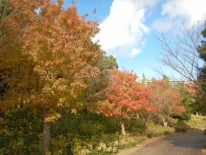 園内で美しく紅葉する樹木No.1はモミジバフウ(写真1枚目)だと思います。今とってもきれいですよ。東浦口ゲートと立体花壇「花火鳥」を結ぶ、池に沿ったルートがおススメです。例年はいまいちパッとしないポプラの丘の上段部(写真3・4枚目)あたりも、今年はきれいです。