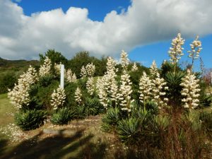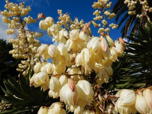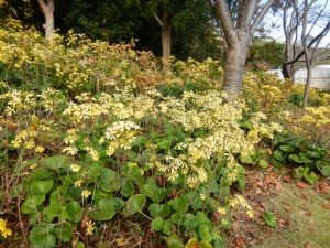 今まさに満開です。1.5~3mくらいの高さまで育ち、5㎝ほどの釣り鐘形の花が豪華にたくさんぶら下がっていますよ。海のテラスのデッキから海岸口ゲート方向を見下ろしても見えますが、見事に咲いていますので、是非近くまで歩いて行って見てみてください。花の谷にも咲いていてが(写真3・4枚目)、数が少なくちょっと迫力不足かもですが、遠くからでもしっかり際立ってみえます。