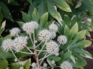 天狗のうちわみたいな大きな葉っぱに、花火のようなちいさいぽんぽんのような花が咲いています。独特の香りがあるのか虫たちに大人気です!?