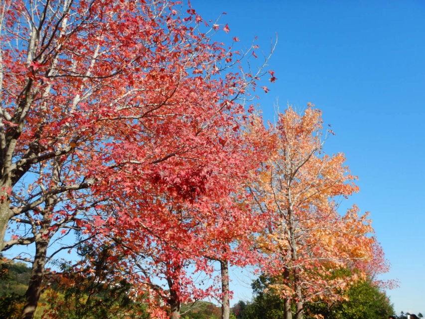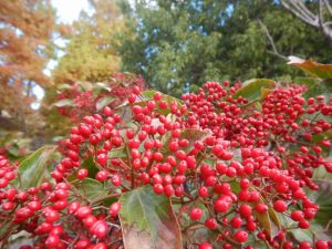 六枚目はナンキンハゼ。緑から赤に紅葉中の葉の合間に真っ白な小さい木の実がみえます。子供の森周辺や花の谷などで見られます。