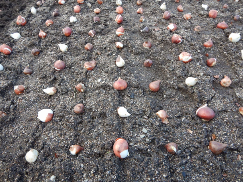 現在ポプラの丘~大地の虹のお花畑では、春の花壇の準備でチューリップ球根を植付け中です。地面にずらっと球根を並べてどんどん植えこんでいきます。