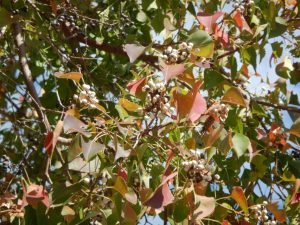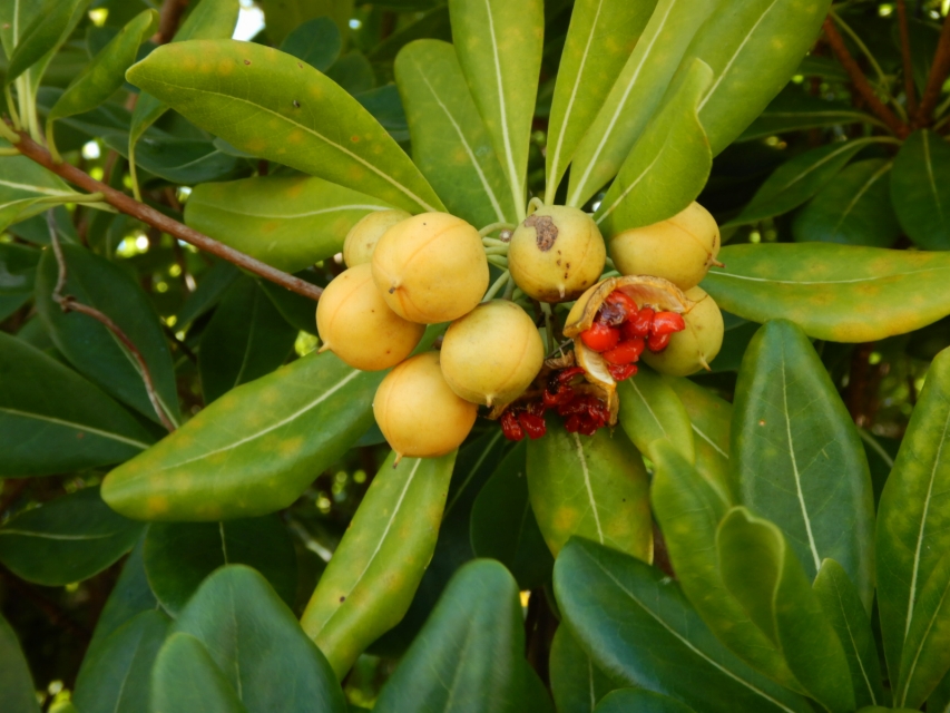 三枚目はトベラ。フレッシュな果実(右側)と、完熟ではじけて種が露出した果実(左側)。見かけの変化が面白いんですよ。海に近い園路沿いで見られます。