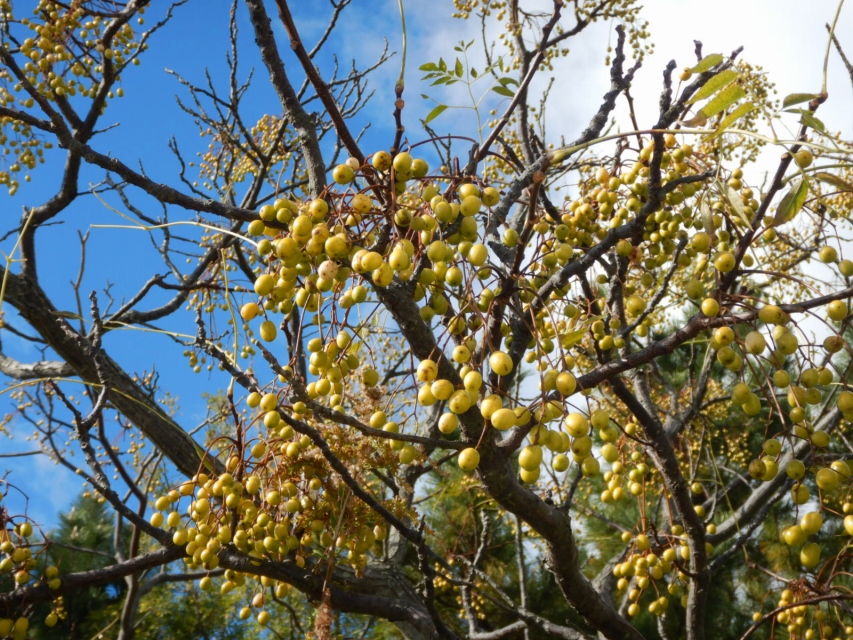 写真一枚目はセンダン。丸々としたかわいい実がかわいさテンコ盛り!海のテラスそばに3本、花の丘道に1本の木があります。