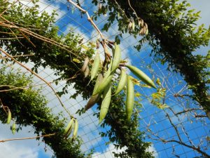 二枚目はノウゼンカズラ。10㎝くらいのバナナみたいなスナップエンドウみたいな実がぶら下がっています。海のテラスそばのアーチに絡まっています。