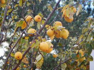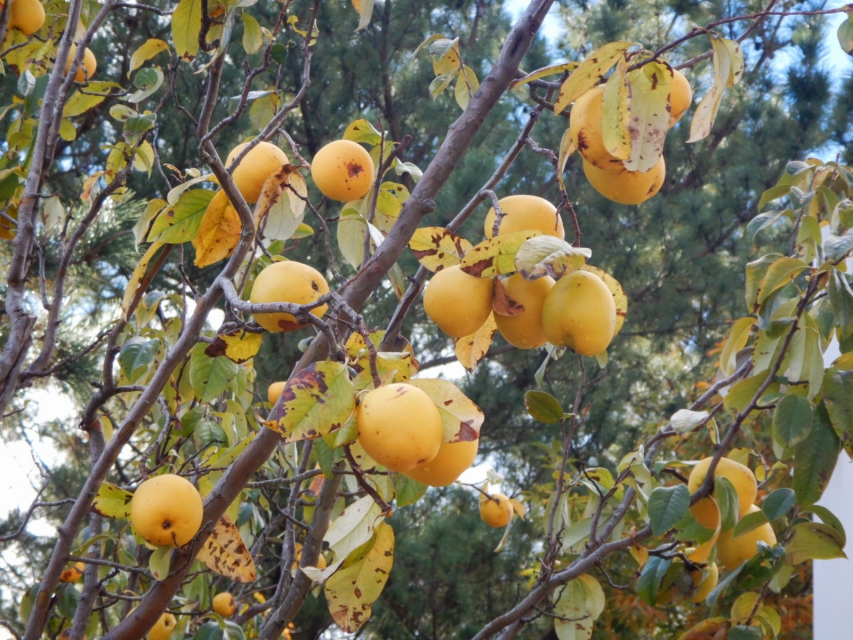 五枚目はカリン。リンゴくらいの大きさの実は非常に硬く、頭に当たるとゲンコツをくらうより痛いかも。松の谷と花の谷の間の園路沿いで見られます。